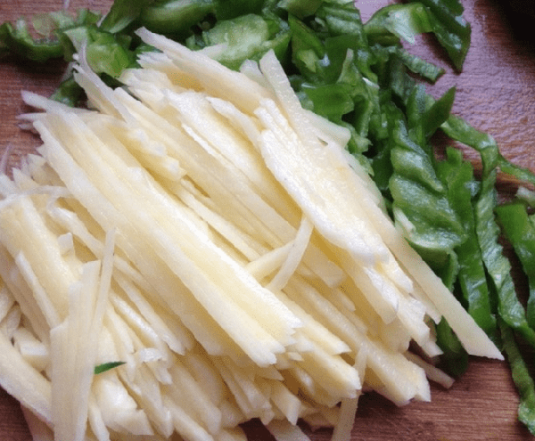 2.把土豆洗凈,削皮切成細絲。將紅椒、青椒也切成細絲。