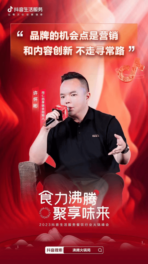 近日,由四川省商務廳、成都市商務局指導,抖音生活服務餐飲業務中心主辦,面向全國范圍內火鍋品類商傢所舉辦的首屆“食力沸騰 聚享味來”行業峰會在成都圓滿落幕。同仁四季椰子雞火鍋(以下簡稱:同仁四季)受邀參加,聯合創始人許懷彬先生出席瞭本次峰會。