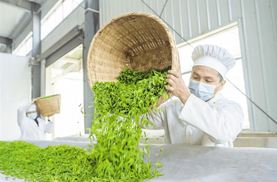 茶廠工作人員攤晾茶青