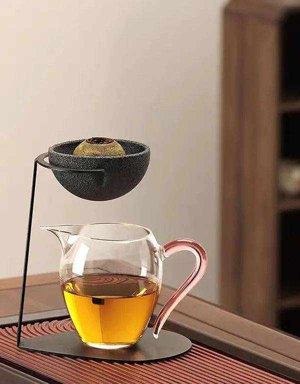 2、用沸水沿小青柑內裡(熟普),邊緣(柑果)緩慢註水,公道杯裡的茶湯直接飲用即可。此方法沖泡方便,簡約,適合口味清淡的朋友