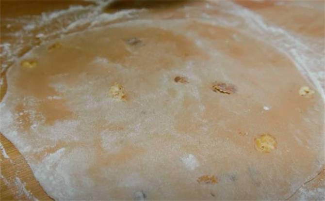 6.這個面皮搟好之後,再搟一張白色的面皮放在上面,這樣一張張錯開疊起來就行瞭,最後再蓋上一張。