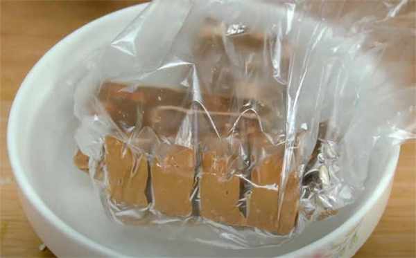 1.把包好的巧克力放在保鮮袋裡,準備一碗熱水,把這個巧克力放在裡面化開。
