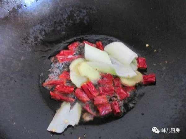 4、放進蔥薑幹紅辣椒炒香,把辣椒蔥薑撈出,把油再燒更熱些,直接倒入調料碗裡,攪拌均勻。
