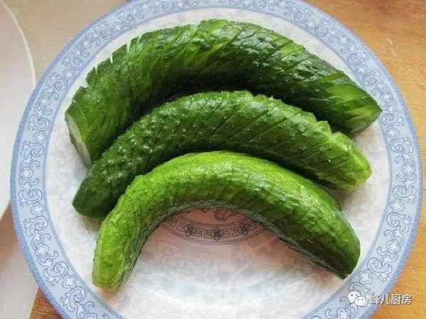 1、黃瓜清洗幹凈,切成蓑衣刀。