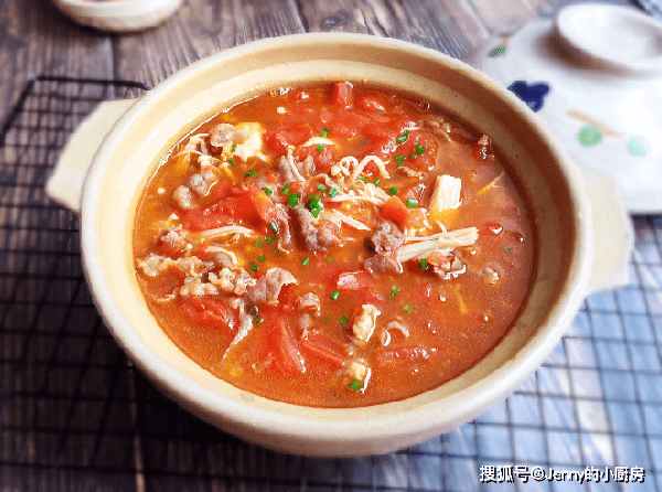 番茄清洗幹凈,入鍋煮一兩分鐘,再將外皮去掉,切成小塊。金針菇去掉根部,清洗幹凈。