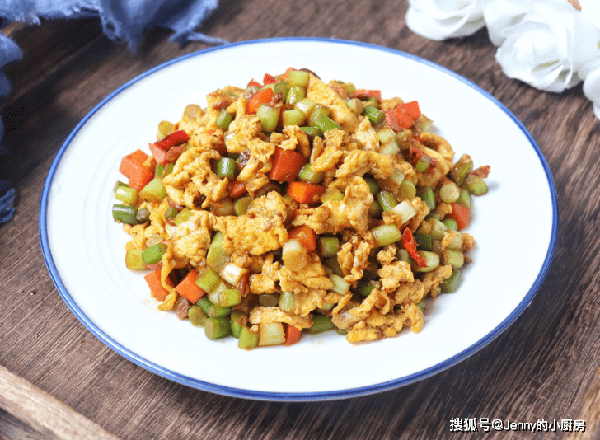 最後加入鹽、生抽、蠔油翻炒均勻,淋少許水快炒幾下,再倒入雞蛋翻炒均勻,這道菜就做好瞭。