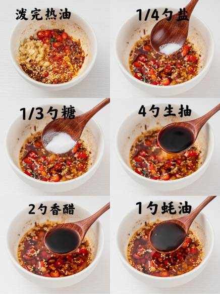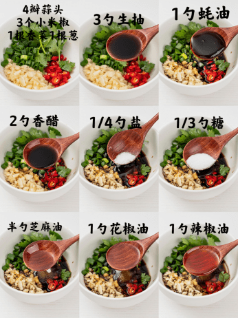 蒜4瓣 小米椒3個 生抽3勺 蠔油1勺 香醋2勺 鹽1/4勺 糖1/4勺 芝麻油半勺 花椒油1勺 辣椒油1勺 蔥1根 香菜1根,又是蒜頭和小米椒! 又是它們,涼拌標配,把我的靈魂標配也放上,香菜和蔥花(不喜歡清直接忽略),加3勺生抽,1勺蠔油,2勺香醋,加點鹽加點糖,再來點芝麻油,芝麻油主要是為瞭提不要太多,多瞭會蓋過花椒油的味道。來1勺花椒油,1勺辣椒油,這一碗,調好的醬汁香味撲面而來,麻香四溢。