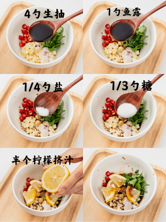 記下我這份特別泰式的泰式酸辣汁,那可不是泡雞爪好吃,就是作蘸料,涼拌蝦,涼拌檸檬魚都巨好吃,你隻需要這些材料:蒜末3瓣 小米椒3個 洋蔥1/4個 生抽4勺 魚露1勺 鹽1/4勺 糖1/3勺 檸檬半個, 香菜一根,先把蒜末,小米椒,洋蔥,香菜放碗裡,接著來4勺生抽整上,再來1勺魚露提提鮮,再來1/4勺鹽,1/3勺糖,最後把半個檸檬,切兩片放進去提香,這樣有檸檬皮的香氣。剩下的檸檬全部擠汁進去,檸檬清香酸爽的味道瞬間蔓延,整個人一下就精神瞭,這個真的太適合夏天瞭,專治各種沒胃口。