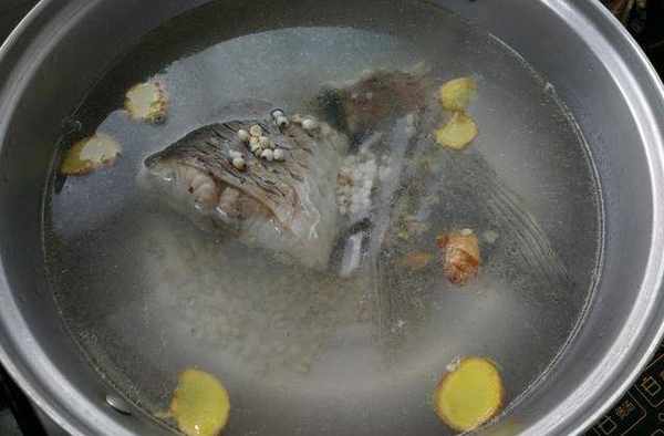 燒沸適量的水,把煎好的鯇魚尾與薑片、薏米一同放在沸水裡,中火開始煮湯,煎魚的油不要放湯裡,因為傢裡人不喜歡湯的表面浮著油花
