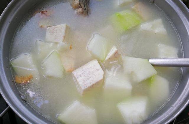 待鯇魚尾在水裡煮至有點發白,把冬瓜塊、香芋塊投入鍋內