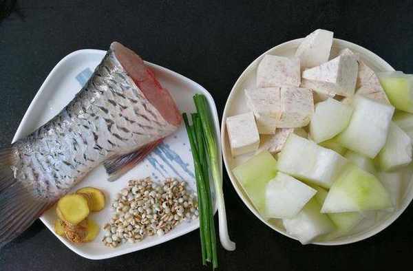 主材料:鯇魚尾1條,香芋200克,冬瓜200克,薏米15克,薑6克,小蔥5克,沙拉油1勺