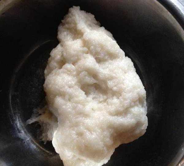 或者將糯米直接搗爛,捶打至出粘性。(沒有石臼可用一個大盆,配合搟面杖敲打。)