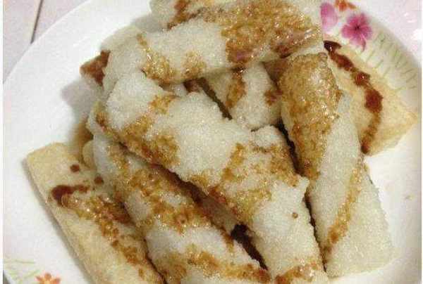 淋上紅糖漿,裹上熟黃豆粉,好吃!