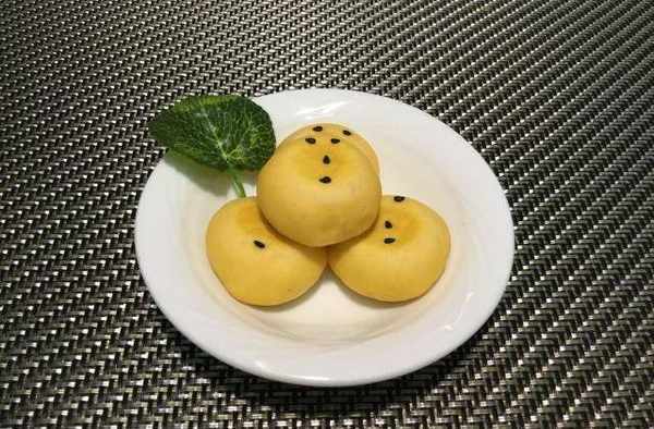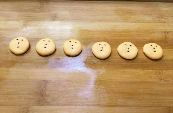 5、按照笑臉的模樣把,用芝麻把眼睛和鼻子,嘴的模樣擺出來,用手按一按,把芝麻按裡去,防止烙時掉下,蓋上保鮮膜二次餳發發十五分鐘,使面團再次蓬松。