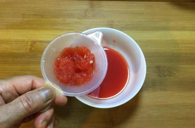 1、我們先制作西瓜汁,用小勺挖出幾塊西瓜後用搟面杖搗成汁,如果用的多的化可以用榨汁機榨汁,這樣更方便。準備個過濾的容器。把搗好的西瓜汁過濾一下,用紗佈也可以,隻要能過濾幹凈就行。將過濾好的西瓜汁裡面放入過濾好的雞蛋清,用筷子攪勻,放在一邊備用。