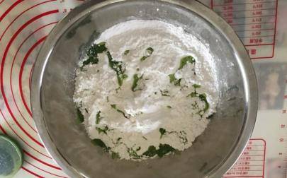 糯米粉、粘米粉混合,倒入艾葉汁,加適量熱水攪拌成絮,用手按壓成面團