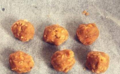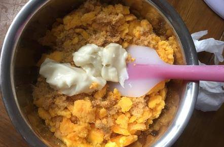 咸蛋先壓碎,然後倒入肉松,色拉醬調和均勻,戴上手套搓成小圓子形狀(稍微捏緊實一點)