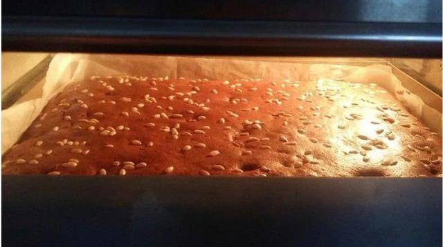 第五步:倒入鋪好吸油紙的烤盤中、厚薄鋪均勻、撒上白芝麻、入爐烘烤30分鐘左右適實際情況定、溫度170左右出爐立即脫模(有不懂的可以留言看到會回)