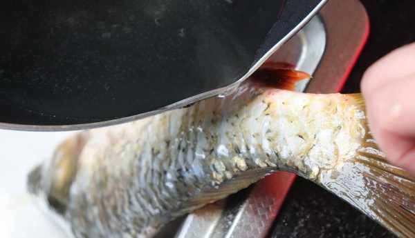 將水燒熱至80度左右,然後用勺子舀熱水淋在魚身上即可。因為魚身上的這種黏液,在遇到熱水的時候,可以被分解。所以,這也是一個很好的去腥方法。