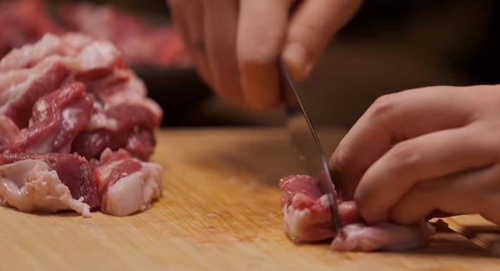 3、 選擇一塊肥瘦相間的豬肉,切成塊。