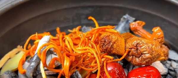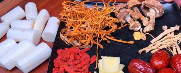 食材準備:烏雞、豬肉、淮山、黨參、蟲草花、紅棗、生薑、幹香菇、枸杞。