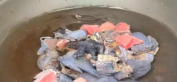 4、 準備一個砂鍋,放入烏雞、豬肉塊、黨參、蟲草花、紅棗、生薑、幹香菇,倒入清水燉煮40分鐘。