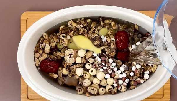 2、 準備一個燉鍋,放入鴨肉、沙參、玉竹、芡實、生薑,倒清水燉煮40分鐘。