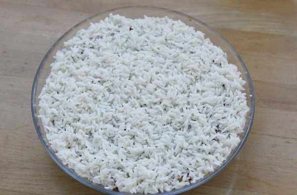 紅棗上面再鋪一層糯米。加入清水和最上面一層糯米水平就可以瞭