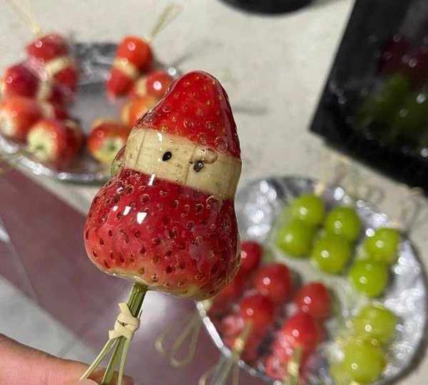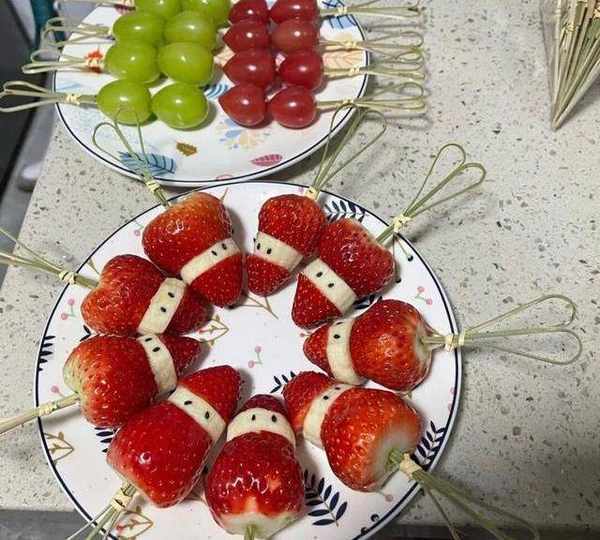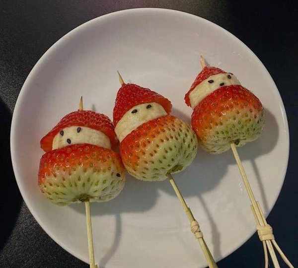 草莓切成兩半,中間放一片香蕉,點兩粒黑芝麻做雪人眼睛