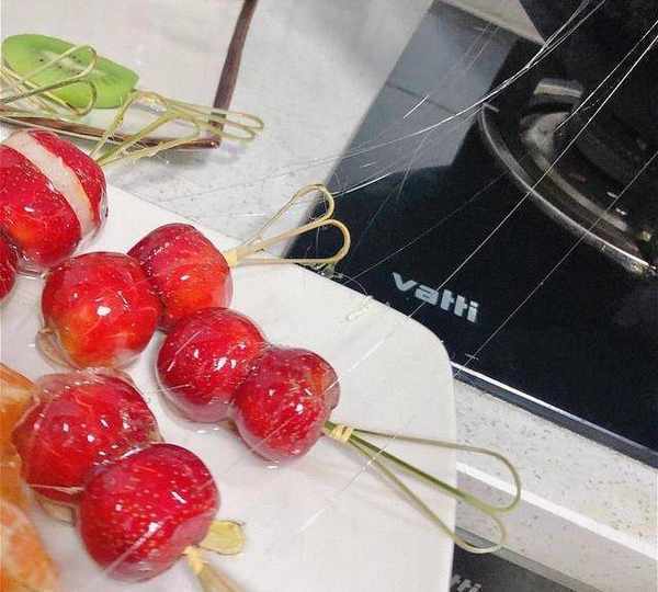 溫馨提示:糖葫蘆做好以後最好馬上吃,不然在屋裡放著糖就化瞭。不馬上吃就用油紙包起來放冰箱冷凍保存,冷凍可以保持一周,吃之前拿出來解凍會兒,等水果不硬就可以吃瞭。