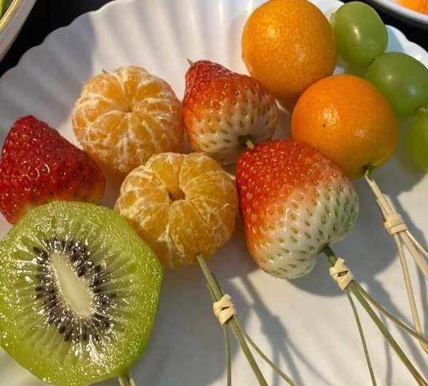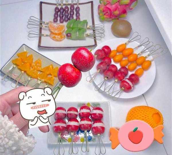 水果洗凈根據自己的愛好串在竹簽上備用(竹簽要提前用開水燙洗消毒吹幹,水果一定要擦幹表面水分)