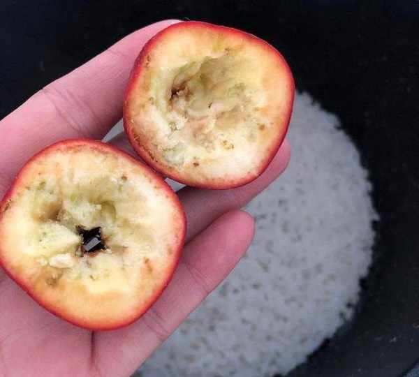 洗凈後對半切開,挖出山楂籽,中間夾煮熟的糯米(純糯米煮飯)