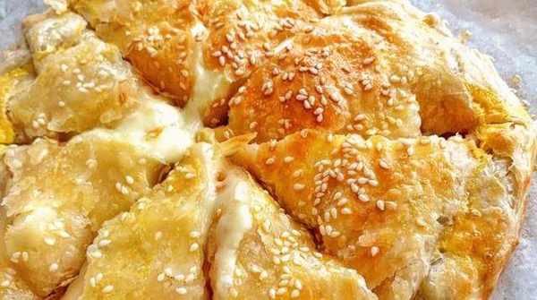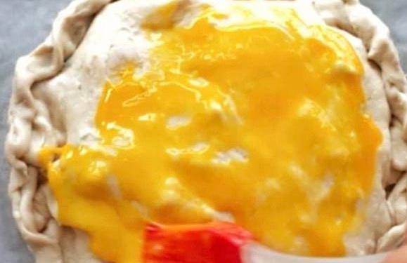 第四步:按照第三步,同樣再拿一張手抓餅,中間鋪上紅薯泥,這一張不用再鋪芝士碎瞭