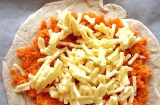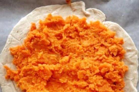 第三步:拿一張手抓餅平鋪在案板上,中間鋪上一層紅薯泥,紅薯泥鋪好後再在紅薯泥上去都鋪一層芝士碎,註意邊上不要鋪紅薯泥,手抓餅邊緣留出一些空白處