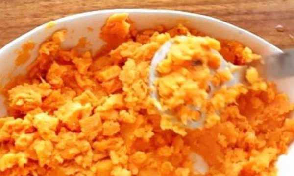 第二步:將買來的紅薯去皮洗凈,洗幹凈的紅薯切均勻厚度的塊狀,然後放入鍋中隔水蒸熟,蒸熟以後搗碎成紅薯泥即可(如果買來的紅薯不是很甜,可以在搗碎的時候加入適量白砂糖)
