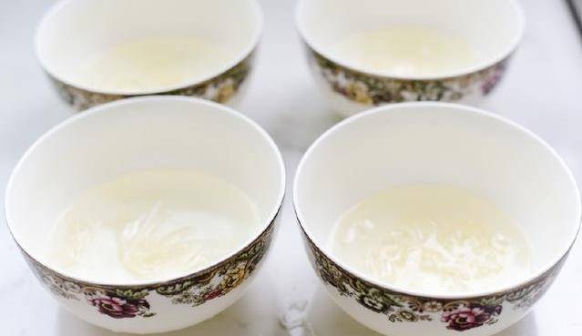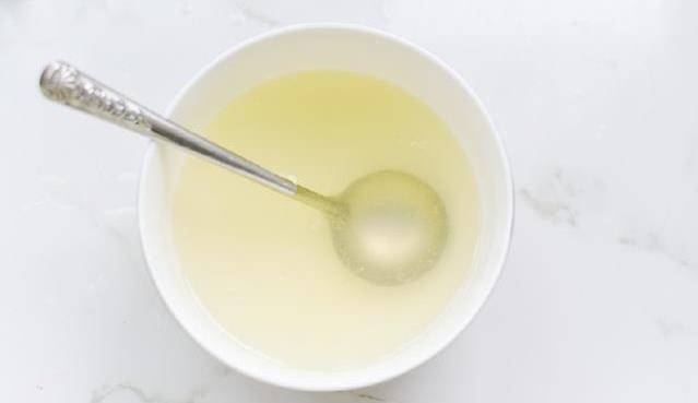7:以檸檬果凍為例,先把吉利丁片用冷水泡開,再隔水加熱融化,取2勺的檸檬果汁加入溶化好的吉利丁裡,攪拌融合。