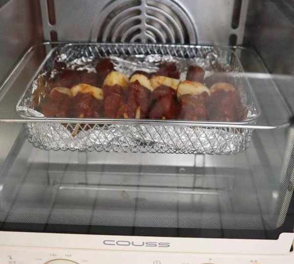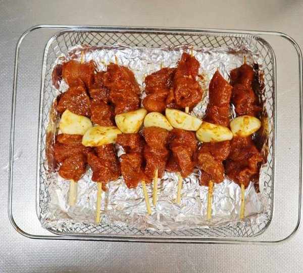 第6步、全部操作完成,烤網中放上錫箔紙,把牛肉串放上去。