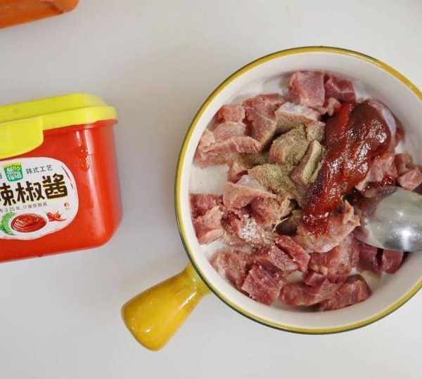 第2步、牛肉丁中加入黑胡椒粉,1勺辣椒醬,1勺紅薯淀粉用少許水化開。