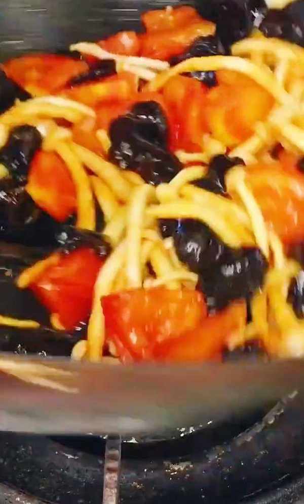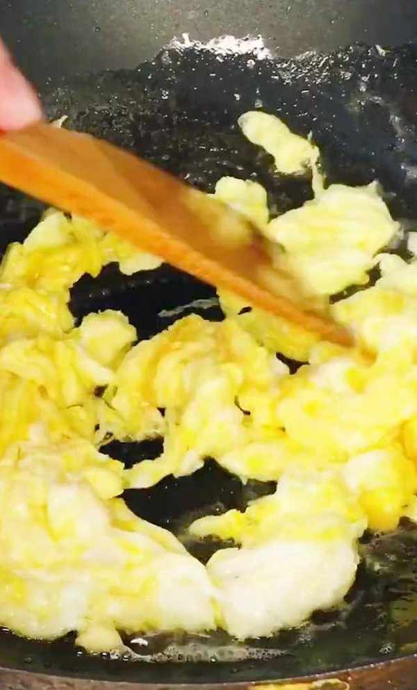 看鍋中油熱瞭,然後下入雞蛋液,拿鏟子給它劃散,雞蛋塊不要太大,拿鏟子切一下,煎至金黃色之後,然後盛出備用。另起鍋燒油,下入蔥蒜爆香,下入番茄炒出湯汁。