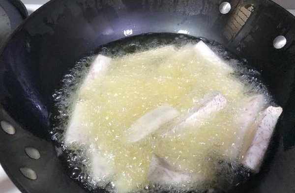 2、鍋內下油燒至6成熱時,下入芋頭炸約8分鐘,芋頭浮起,熟透即可撈出。