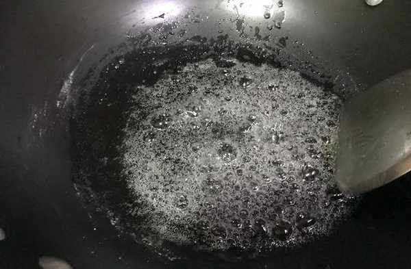 4、鍋內留薄薄一層底油,燒熱後調小火,倒入白糖和少量水,攪拌均勻。