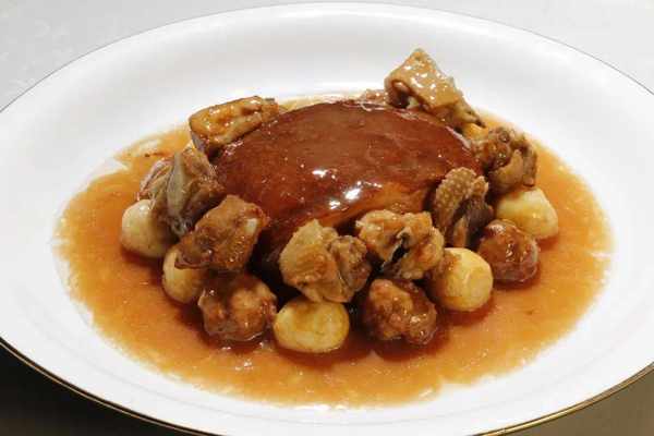 2、鍋燒熱,雞油爆香薑、蔥及香料,加入清湯、蠔油、雞湯、糖色、炸好的食材,燒沸撇去浮沫,小火煨至肉質軟糯,撈出裝盤;