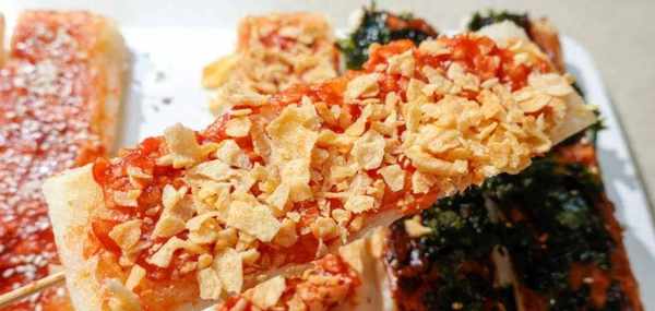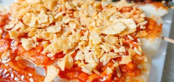 3.番茄薯片味:山藥脆片壓碎,和番茄醬拌勻,年糕控油後串上竹簽