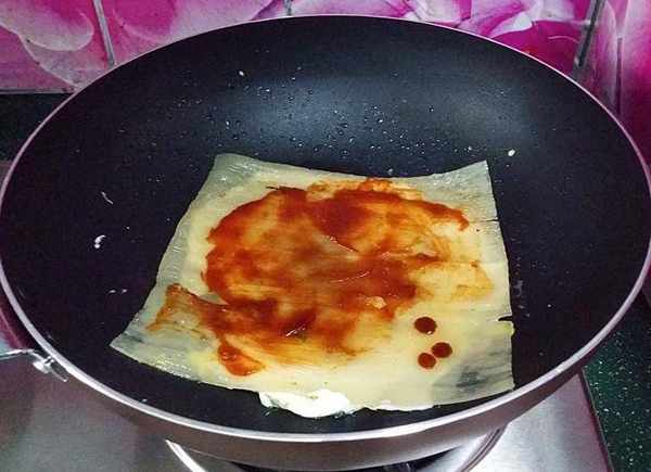 4、將原配的番茄醬、冷面醬塗抹在冷面上