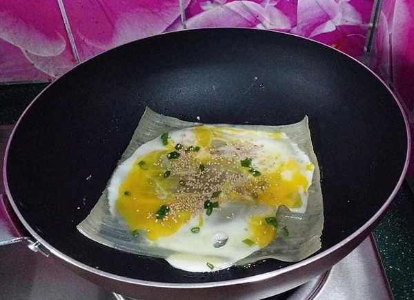 3、接著撒些芝麻和蔥花、待蛋液快要凝固時及時翻面