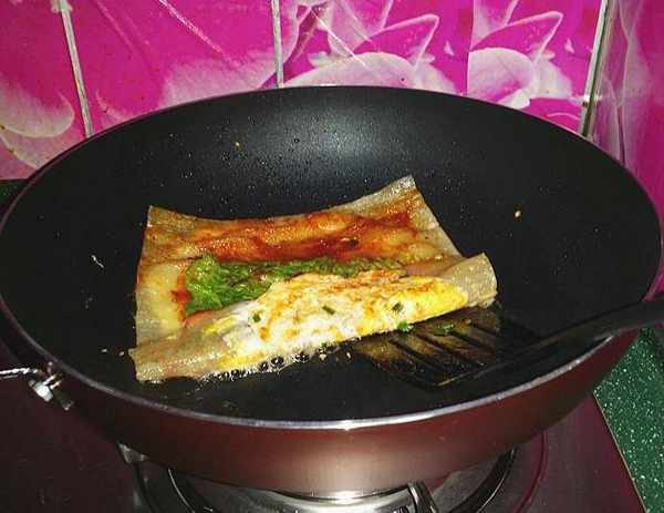 2、不粘鍋燒熱滴少許油:放入一片冷面、接著打一個雞蛋,再用鍋鏟將蛋液攤開