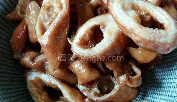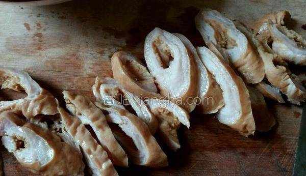 1.鹵煮大腸頭斜切成5mm厚的“馬耳朵”塊。