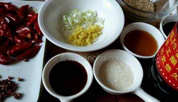 鹵煮豬大腸頭400克、菜籽油適量、幹紅椒30克、杭椒兩個、紅袍花椒5克、德陽紅醬油10克、生抽10克、料酒5克、白糖3克、熟白芝麻少許、蔥米、薑米少許