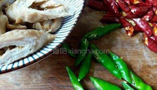 2.幹紅椒從中間斜切,一分為二。杭椒也斜切與幹紅椒差不多長的節。
