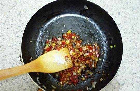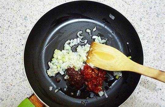 接著我們另外起鍋燒油鍋中加入少量的食用油,油溫燒熱之後把已經準備好的蒜末和蔥末放入鍋中小火爆出香味,然後加入兩勺豆瓣醬和切碎的剁椒放入鍋中一起去煸炒。